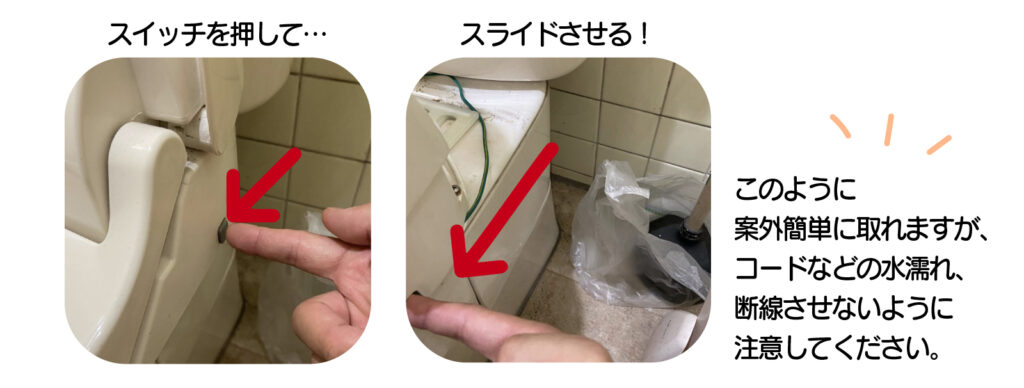 意外と見落とされるのが、「ウォシュレットの隙間」掃除です。ウォシュレットは外すことができます。側面のボタンを押してスライドさせると簡単に外れます。取扱説明書をよく読んでから行うようにしましょう。